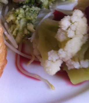 1kg Blumenkohl im Salzwasser weichkochen und mit Meersalz und Pfeffer würzen. Lauwarm anrichten mit darunter gemischten 3 Esslöffeln Cassisgelee, Cassisessig und Meerrettichsprossen.