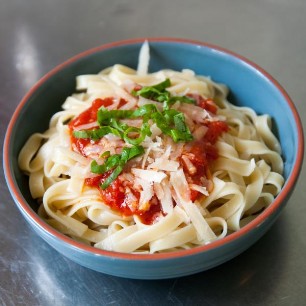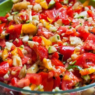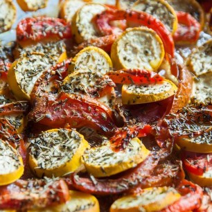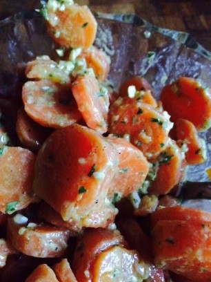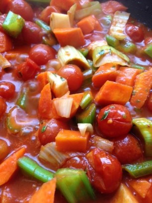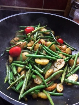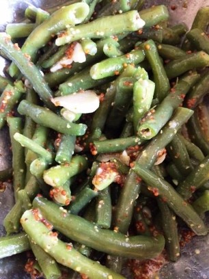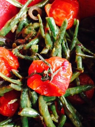 500g Bohnen, der Länge nach schneiden und in Olivenöl mit roter Zwiebel, Ysop, Thymian, Pfefferminz, Salz und Pfeffer anbraten. 12 kleine Tomaten auf ein Blech setzen und im Ofen ca. 30 Minuten schmoren lassen. Dressing aus Senf, Aceto Rosso, Pfeffer und Salz. Schwarze Olivenringe dazugeben. Zuerst die Bohnen mit dem Dressing vermengen, danach vorsichtig die Tomaten dazugeben. Passt zu frischem Brot.