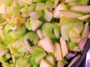 6 - 8 Rhabarber Stangen, 1-2 entkernte Chilischoten, eine kleine feingeschnittene rote Zwiebel und Knoblauchzehe, Meersalz und Pfeffer. Alles im Olivenöl anbraten, mit Aceto Bianco ablöschen und darin weichkochen.