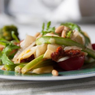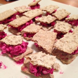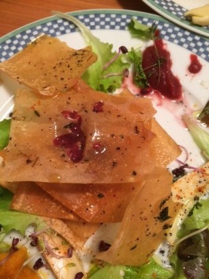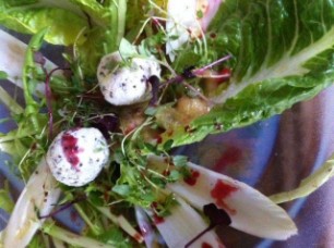 Diverse Winter- und Frühlingssalate zerzupfen und auf Teller anrichten. In den Ziegenfrischkäse kleingeschnittene Oliven, Thymian und geriebenem Parmesan hineinkneten und Kugeln formen. Pikantes Rhaberbermus (vgl. separates Rezept) auf verteilen dem Salat. Salatsauce aus Cassisessig, Olivenöl, Meersalz, Pfeffer und frischen Kräutern.
