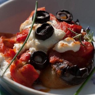Tomaten, Auberginen, Oliven, Mozzarella und Ziegenfrischkäse