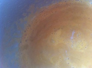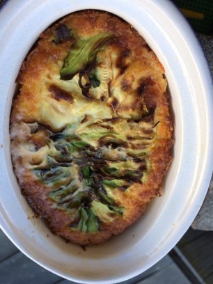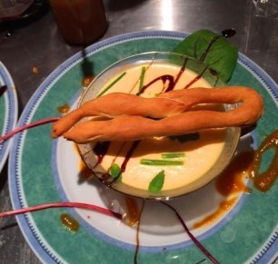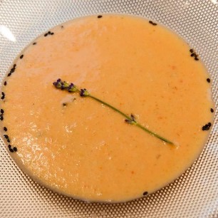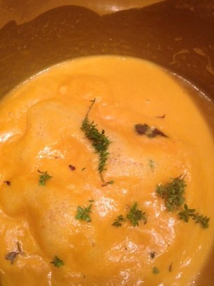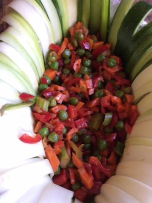 6 mittlere Tomaten, 1 kleine Zucchetti, ½ Aubergine, 1 rote Zwiebel und Knoblauchzehe, kleinschneiden und in Olivenöl weichkochen. Anschliessend mit 2 - 3 dl Milch pürieren. Meersalz und Pfeffer zum Würzen.