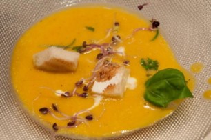 2 Zucchetti, 250g Erbsen, 30 Pfefferminzblätter, 1 rote Zwiebel und Knoblauchzehe, Salz und Pfeffer, in Olivenöl anbraten. Mit Wasser ablöschen, weichkochen und pürieren. Ca. 1 dl Rahm darunterrühren und mit Meerrettich- oder Senfsprossen verzieren.