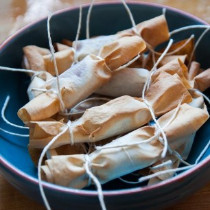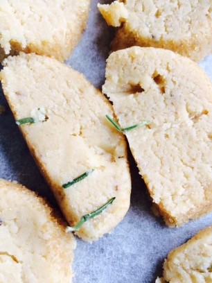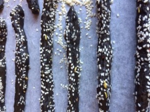 Ausgewalltes Teigblatt mit Olivenöl bestreichen, frischen oder getrockneten Kräutern und Parmesan, Pfeffer und Salz, darüber verteilen und vor dem Backen in 1,5cm breite Stangen schneiden.