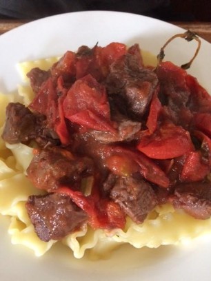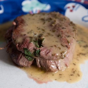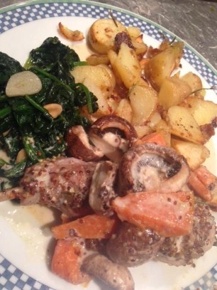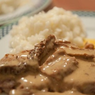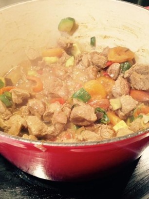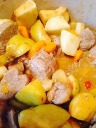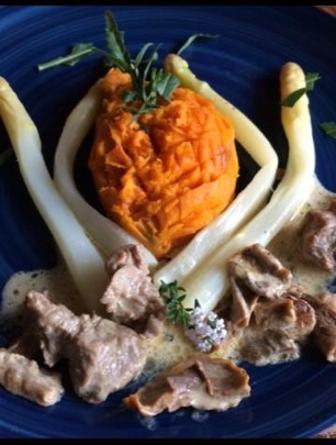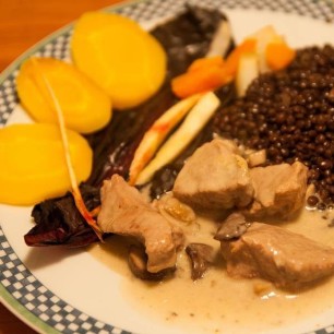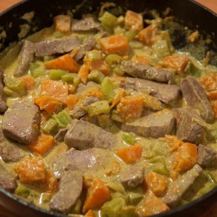 800g Kalbsragout, 1 rote Zwiebel, 2 Knoblauchzehen, 4 - 6 violette Karotten, kleingeschnitten in Butter anbraten und mit Sherry ablöschen. Meersalz, Pfeffer, Thymian, Mayoran, Ysop, Schnittlauch zum Würzen. Binden mit einem Esslöffel Mehl. Immer wieder ein wenig Wasser dazugiessen und während 45 - 55 Minuten köcheln lassen. In den letzten 10 Minuten 1 - 2dl Rahm unterziehen.