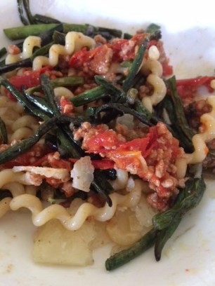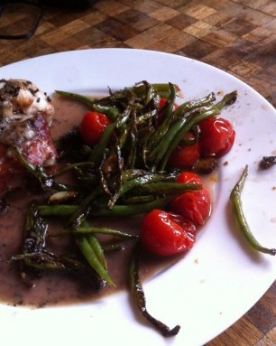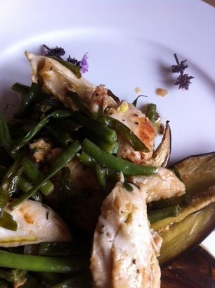 Bohnen in mundgerechte Portionen zerkleinern und wie im "Bohnenrezept" beschrieben zubereiten. Pouletbrüstchen in breite Streifen schneiden. Die Bohnen und Poulet in der selben Pfanne mit Butter und roter Zwiebel anbraten. Mit Thymian, Meersalz und Pfeffer würzen. Nach ca. 25 Minuten mit den Auberginen servieren.