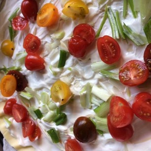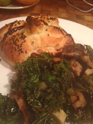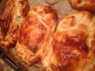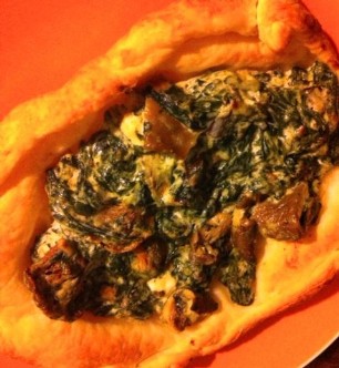 1kg frischen Spinat, putzen und in der Pfanne zusammenfallen lassen. Die heisse Masse mit 100g Ziegen- und/oder Frischkäse, 80g gedörrten Steinpilzen, 1 roter Zwiebel und Knoblauchzehe, Mayoran, Thymian, Pfeffer, Ysop, Bohnenkraut, Meersalz, 50g geriebenenem Parmesan gut zusammenmischen. Die Masse auf Blätterteig verteilen und bei 15 - 18 Minuten, 220 Grad Umluft backen.