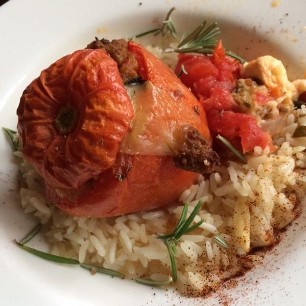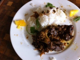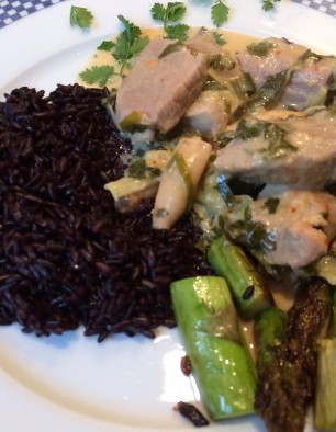 800g Lammragout zusammen mit 200g schwarzen Linsen, Broccoli und einer roten Zwiebel in der selben Pfanne anbraten. Tomatenmark, scharfes Currypulver und Tamarindenpaste zum Würzen. Mit Weisswein ablöschen und während 40 Minuten weichkochen. Mangoschnitze aus der Dose mit Saft pürieren und mit 2dl Kokosnussmilch sämig kochen. Passt zu Mandel-Korianderreis. Dazu Mandelstifte im Butter anbraten und mit dem Koriander unter den Reis ziehen.