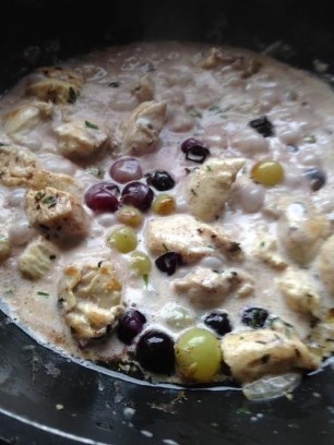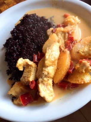 500g Pouletfleisch in kleine Stücke schneiden und scharf anbraten. Anschliessend Rote Zwiebel, je 80g getrocknete Physalis und Cranberries, 1 Banane in Scheiben, je eine Handvoll Macadamia-Nüsse und Cashew-Kerne hinzugeben. Mit Meersalz und scharfem Currypulver grosszügig würzen. Mit 2 dl Rahm oder Kokosnussmilch ablöschen und 15 - 20 Minuten köcheln lassen. Passt zu Basmatireis.