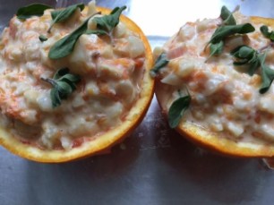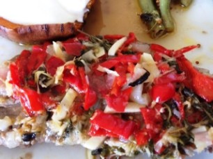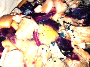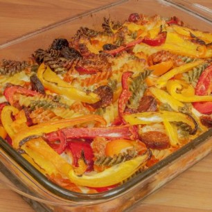 4 Chicorée und rote Zwiebel kleinschneiden, in Gratinform füllen. Leichte Béchamelsauce (halb Wasser/Milchgemisch), Muskatnuss, Kräutersalz und Pfeffer darübergiessen. Grosszügig Parmesan darüberstreuen und bei 15 - 20 Minuten im Ofen, 220 Grad Umluft, backen.