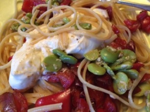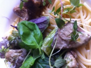 400g Austernpilze, 500g grüner Spargel, mundgerecht zerkleinern und anbraten in Butter. Mit 1dl Weisswein und 1dl Rahm ablöschen und ziehen lassen. Meersalz, Pfeffer, Thymian, Kresse, roter und grüner Basilikum zum Würzen. Passt zu Spaghetti und Nudeln.