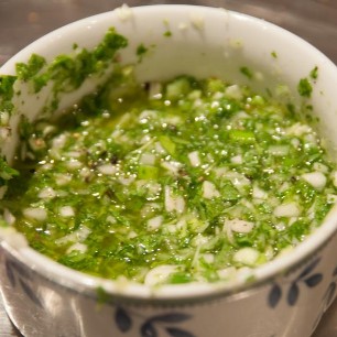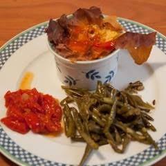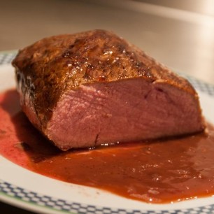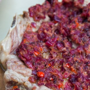 Mit Preiselbeer Confitüre, frischem Löwenzahn, Schnittlauch und gehackten Haselnüssen servieren.