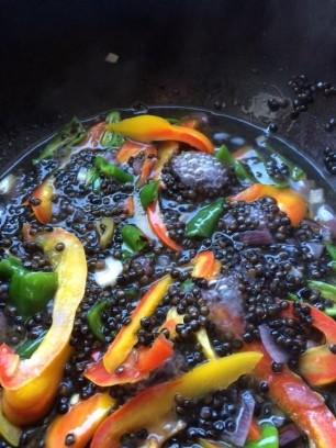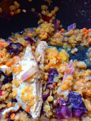 500g grüner Spargel zusammen mit einer gehackten roten Zwiebel und Knoblauchzehe in Olivenöl anbraten.