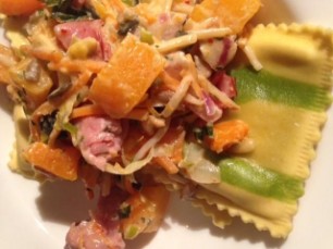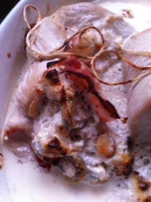 Trutenfiletstück, 5cm dick. Tasche einschneiden und mit einer Scheibe Rohschinken belegen. 80g Frischkäse mit Handvoll kleingeschnittenen grünen oder schwarzen Oliven und Kapern, Meersalz, Kräuter und Pfeffer zu einer Masse verarbeiten und damit die das Fleisch füllen. Mit Küchenschnur zusammenbinden. Im Ofen gratinieren während 18 - 22 Minuten bei 220 Grad Umluft gratinieren. Mit 2 dl Portwein übergiessen. Passt zu Knoblauchkartoffelstock.