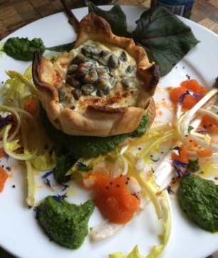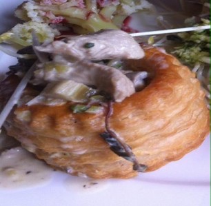 Vol au Vent mit Rhabarber, Trutenfleisch, braunen Champignons