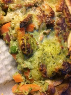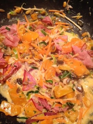 Je eine grosse orange, gelbe und violette Karotte, je eine rohe rote, gelbe und gesteifte Rande (Rote Beete), 1 rote Zwiebel und Knoblauchzehe. Alles kleinwürfeln. 3 Pouletbrüstchen scharf anbraten und auskühlen lassen. Im Cutter zerkleinern, mit dem Gemüse und 250g Ricotta vermischen. Mit Meersalz und Pfeffer würzen. Ist die Masse zu kompakt, ein wenig Rahm hinzugeben. Alles auf den Strudelteig verteilen und mit einem Ei bepinseln. Schwarzen Sesam darüberstreuen. Während 18 - 22 Minuten backen, 220 Grad Umluft.