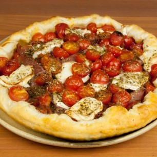 4 Birnen und 100g Roquefortkäse würfeln und auf Teigboden verteilen. Guss aus drei ganzen Eiern, 3dl Rahm, Meersalz, Pfeffer darüber verteilen. Backen während ca. 25 - 35 Minuten, 220 Grad Umluft.